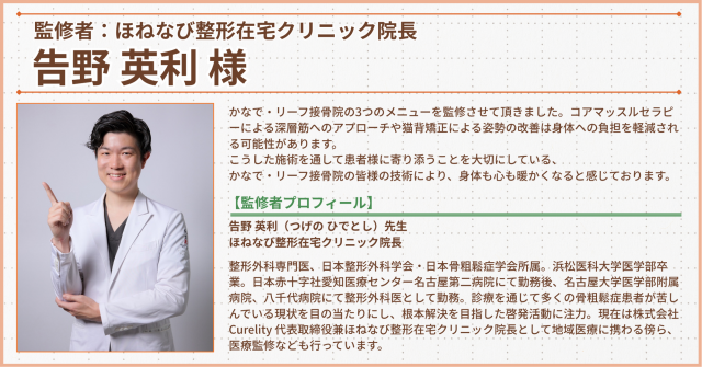 体調改善の最後の切り札として「リーフ整骨院」スタッフの皆さん親切で優しく安心して通院しています。