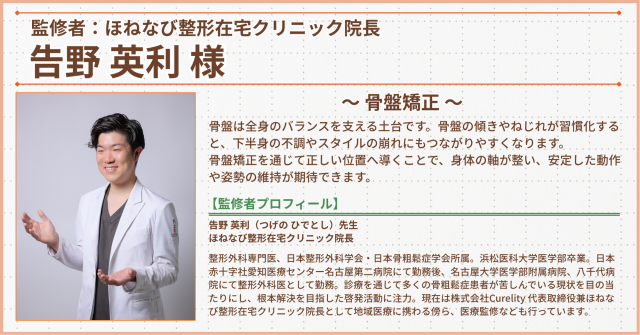 問診・検査で患者様の骨盤の状態を確認し、矯正を行っていきます。また骨盤の歪みの原因としてインナーマッスルの低下も挙げられますので、しっかりトレーニングを行っていきます!